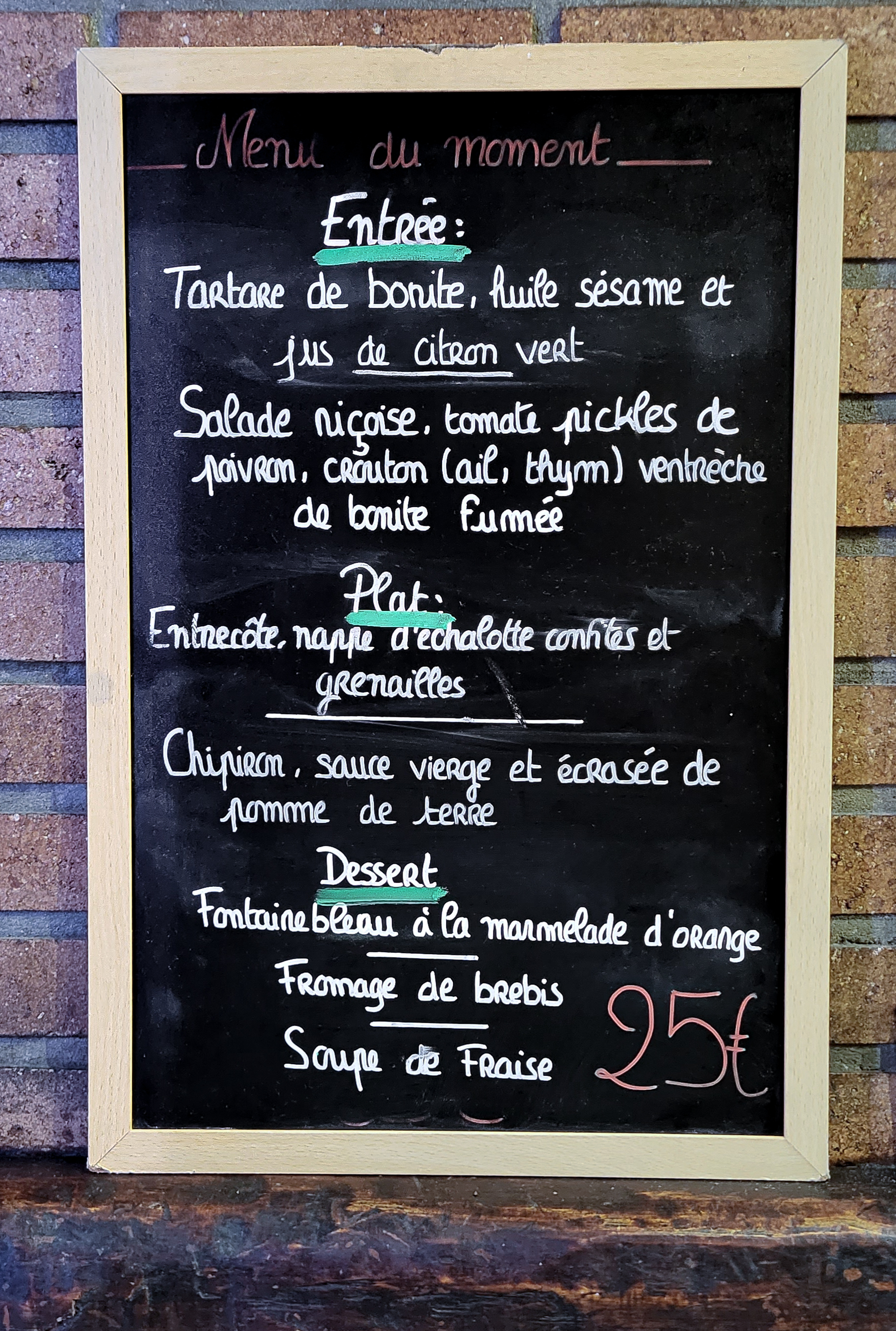 Une expérience décevante vis à vis des commentaires précédents. Repas à 3 et 1 enfant. Menu enfant : les parts sont très réduites. Heureusement le notre a 3 ans mais on se demande comment un enfant de 10 ans peut s'en contenter. De plus purée de patate douce à la commande et c'est un écrasé de pommes de terre qui arrive avec un petit morceau de poisson grillé ; qui plus est bien en décalé des entrées adultes. Adultes : le menu ne nous est pas proposé. Mais il le sera à la table d'à côté... Les entrées sont correctes mais en plat il doit falloir privilégier la viande. A 50 mètres de la plage c'est dommage. Les tentacules de chipirons ne sont pas cuites et la sauce à l'orange est bien trop présente. Bref, beaucoup d'attente et une déception globale. Serveuse qui manque d'organisation. 32 euros par personne sans dessert... Et une petite vérification orthographique de la carte et de l'ardoise ne serait pas du luxe...