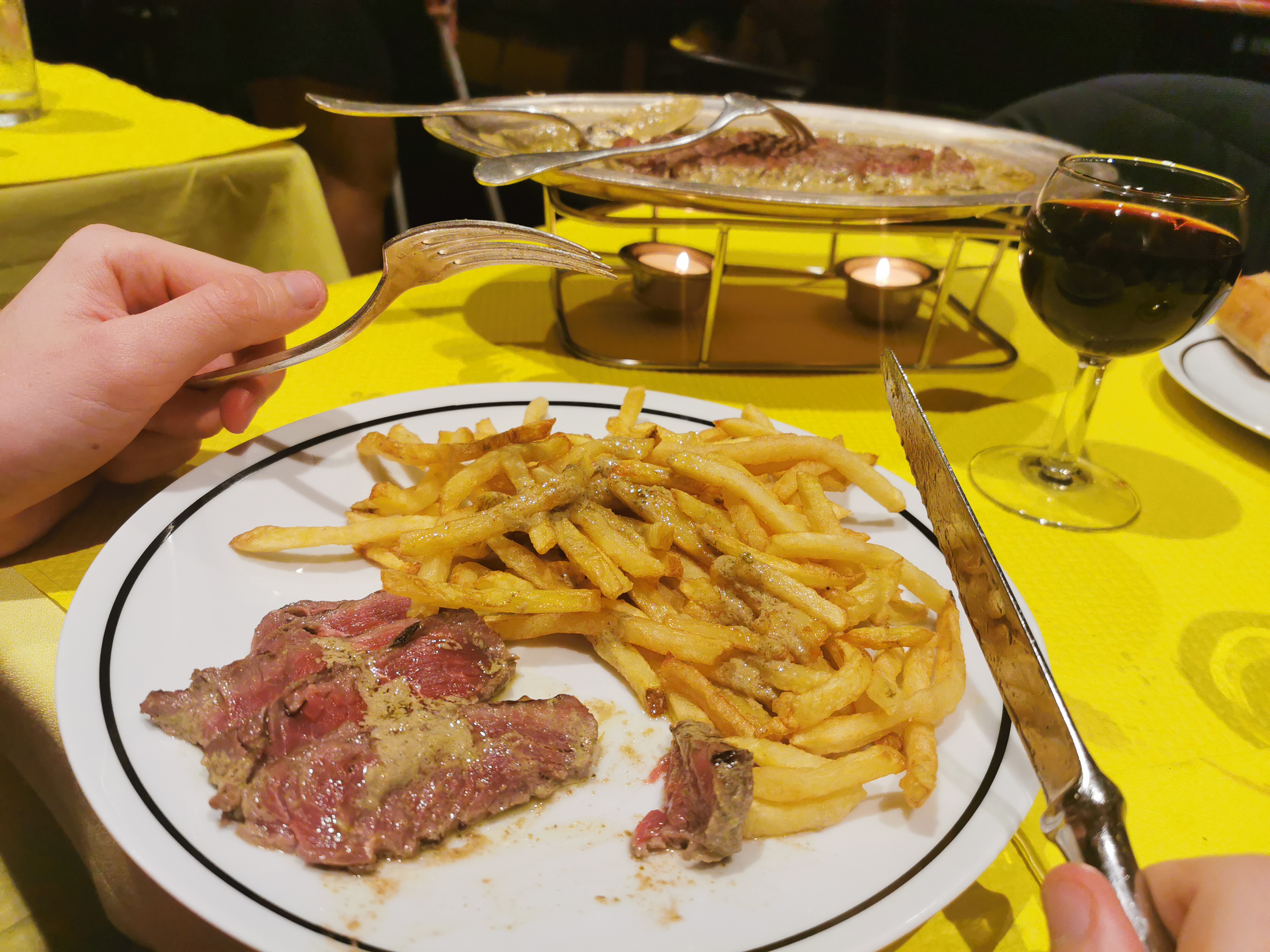 Je suis venue en tant que touriste, et j'ai ADORÉ. Ils proposent un plat, pure efficacité. Salade verte aux noix, puis entrecôte coupée finement servie en sauce style Café de Paris mais en meilleur, et frites maison à volonté. Qualité de la viande incroyable. Le tout pour 20 euros par personne (2 plats de viable par personne). Joli choix de desserts et glaces artisanales. Ça me manque déjà. Je recommande vivement !