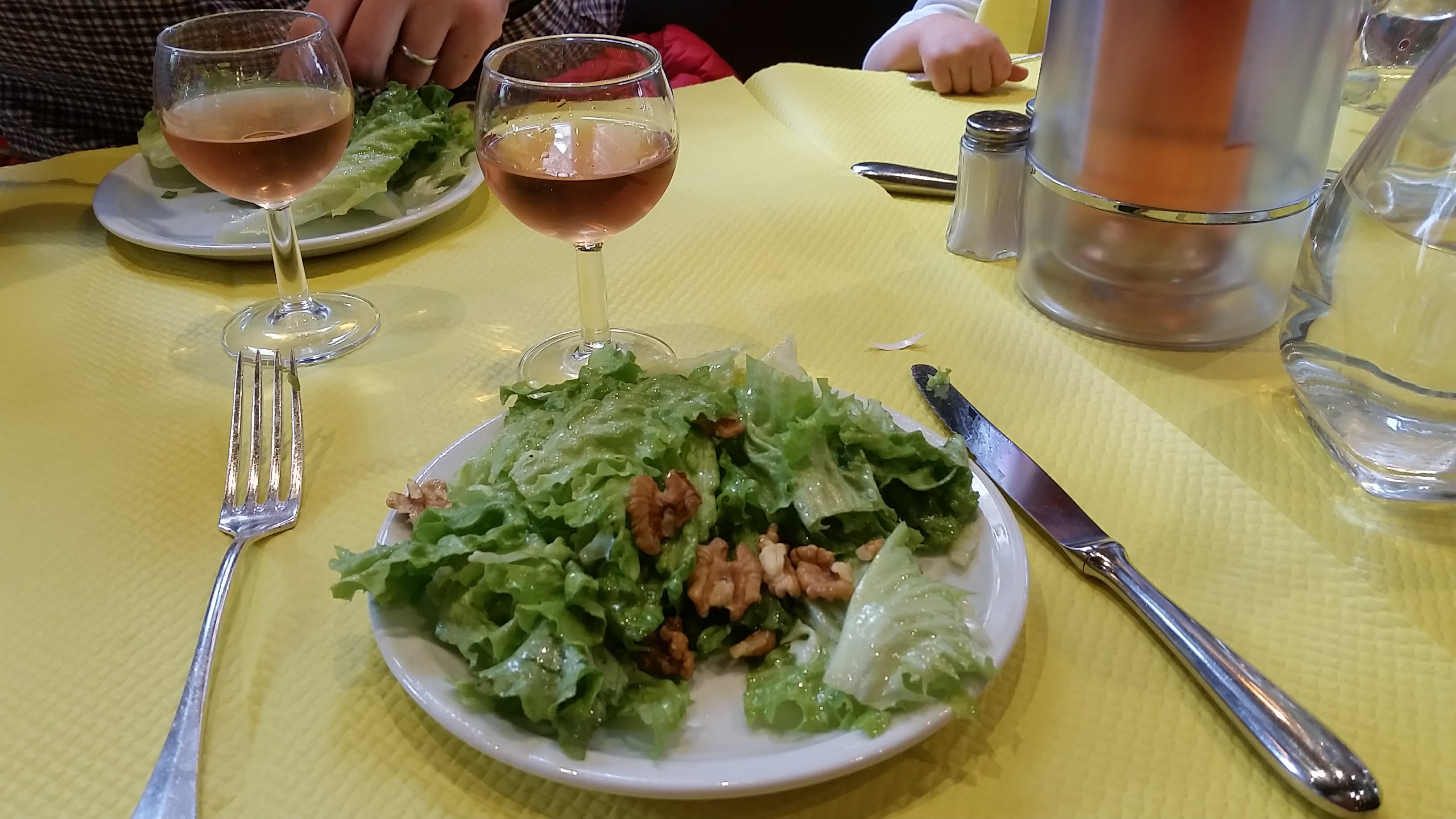 Super restaurant avec plat unique : salade aux noix, faux filet avec sa fameuse sauce et frites à volonté ! Très efficace !