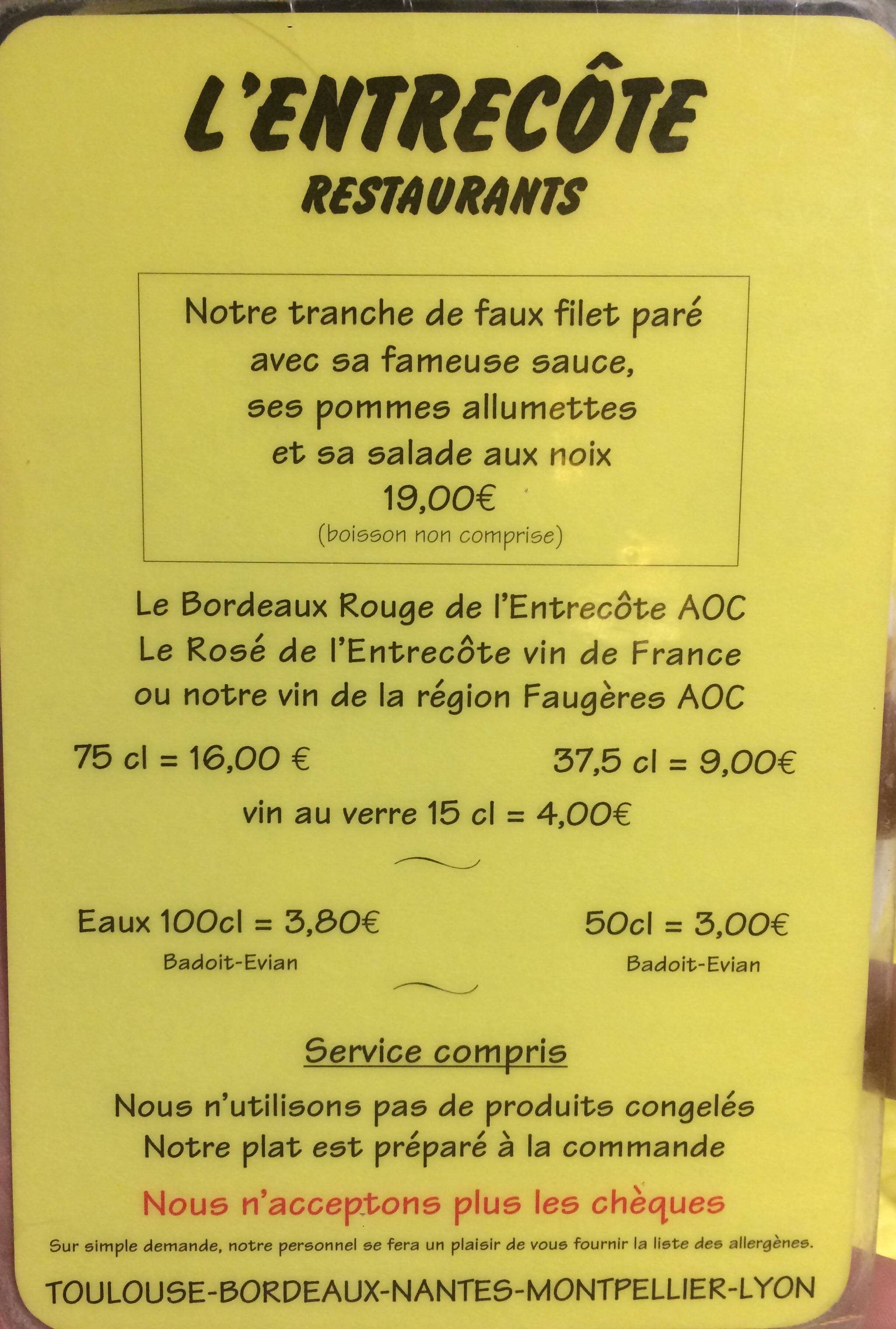 L’entrecôte est un restaurant de haute qualité à menu unique dont la composition est: -Entrée: Salade avec des noix + filet d’huile d’olive -Plat: Entrecôte (cuisson au choix) + frites (très bonne d’ailleurs!) Le dessert n’est pas unique il y en a plusieurs et au choix.Tout pareil pour les boissons! Personnel agréable et sympa, nous avons passé un très bon moment en famille, et l’ambiance est apaisante! Je ne vous cache pas que le prix est un tout petit peu élevé mais je vous assure ça en vaut la peine!