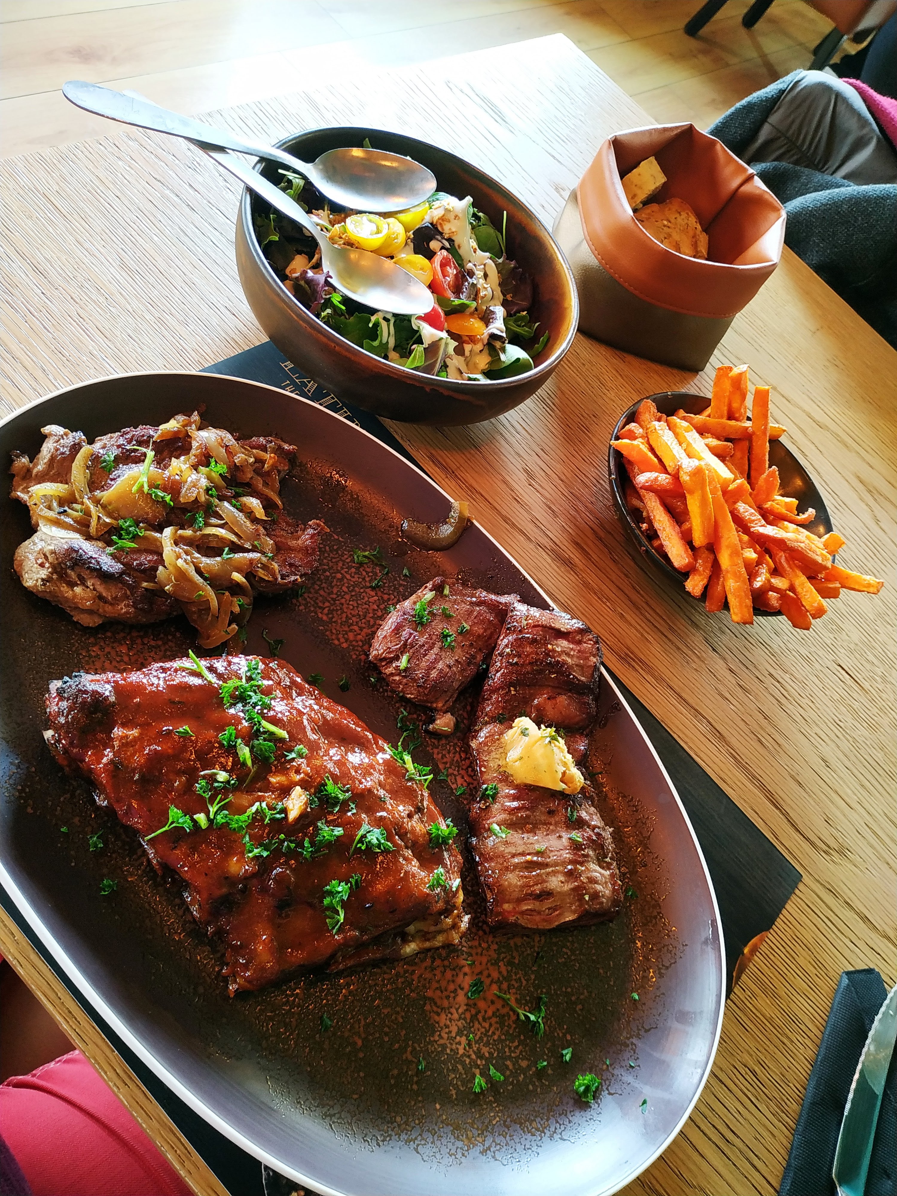 Venez avec votre appétit, vous allez en avoir besoin. Les quantités sont généreuses et la viande est tendre. J'ai pris une planche découverte avec trois viandes (pluma de porc, steak et ribs), je pensais avoir 3 petits bouts et j'ai eu quasiment trois plats ! Tout était très bon, servit avec des frites et une belle salade. Service sympa et efficace.