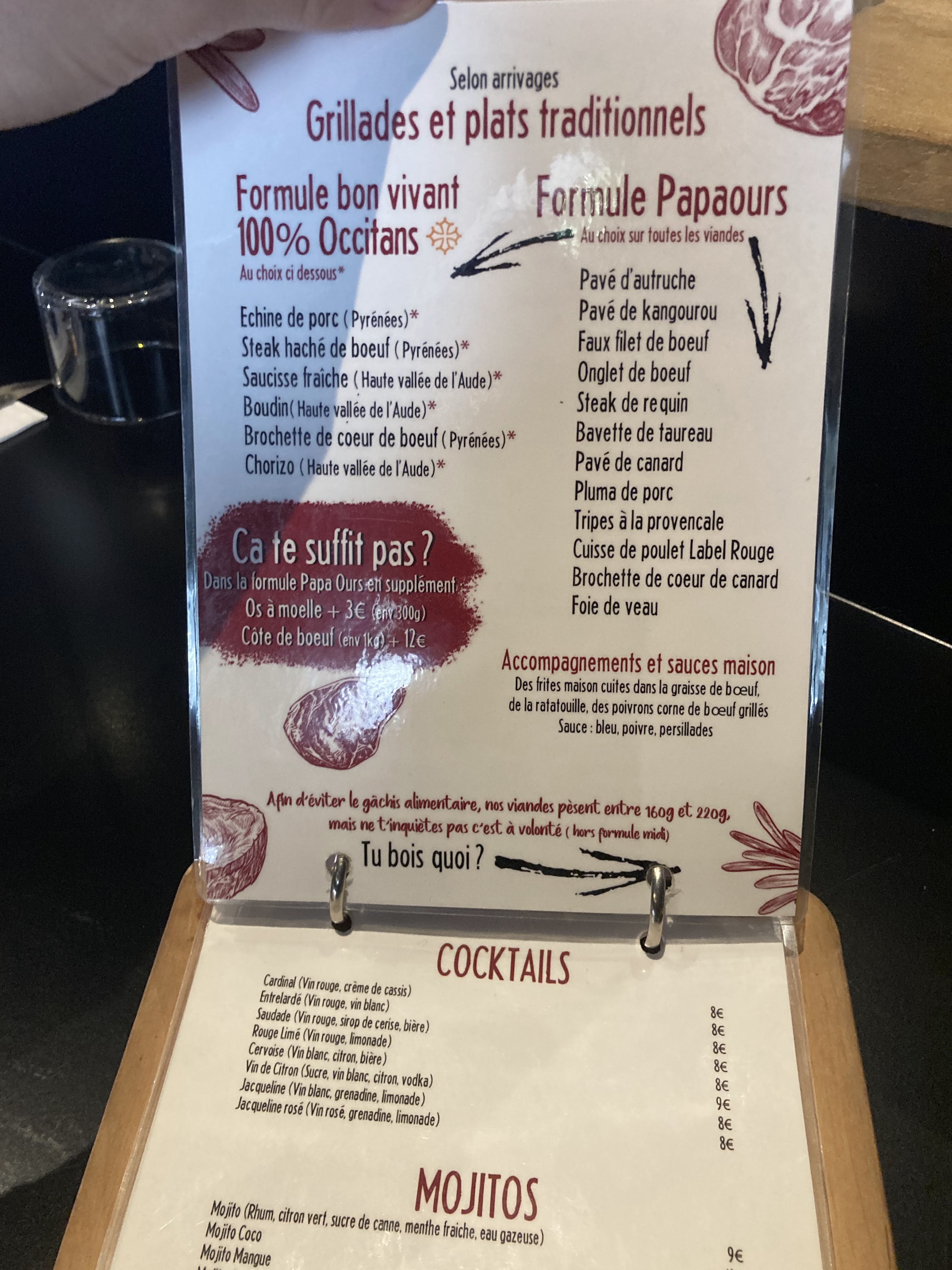 Posté le 03/11/2024 à 23:37"Le seul endroit que je connaisse où on peut manger du kangourou, ou de l'autruche (le zèbre était indisponible lorsque j'y suis allée), le tout pour moins de 40 euros, et à volonté! Le concept est génial, unique, et les serveurs se font tutoyer et tutoient (ça donne un vrai plus niveau ambiance). Merci encore à Guillaume!! J'y reviendrais avec un grand plaisir! A noter pour les vegetariens: ils ont du steak de requin..."