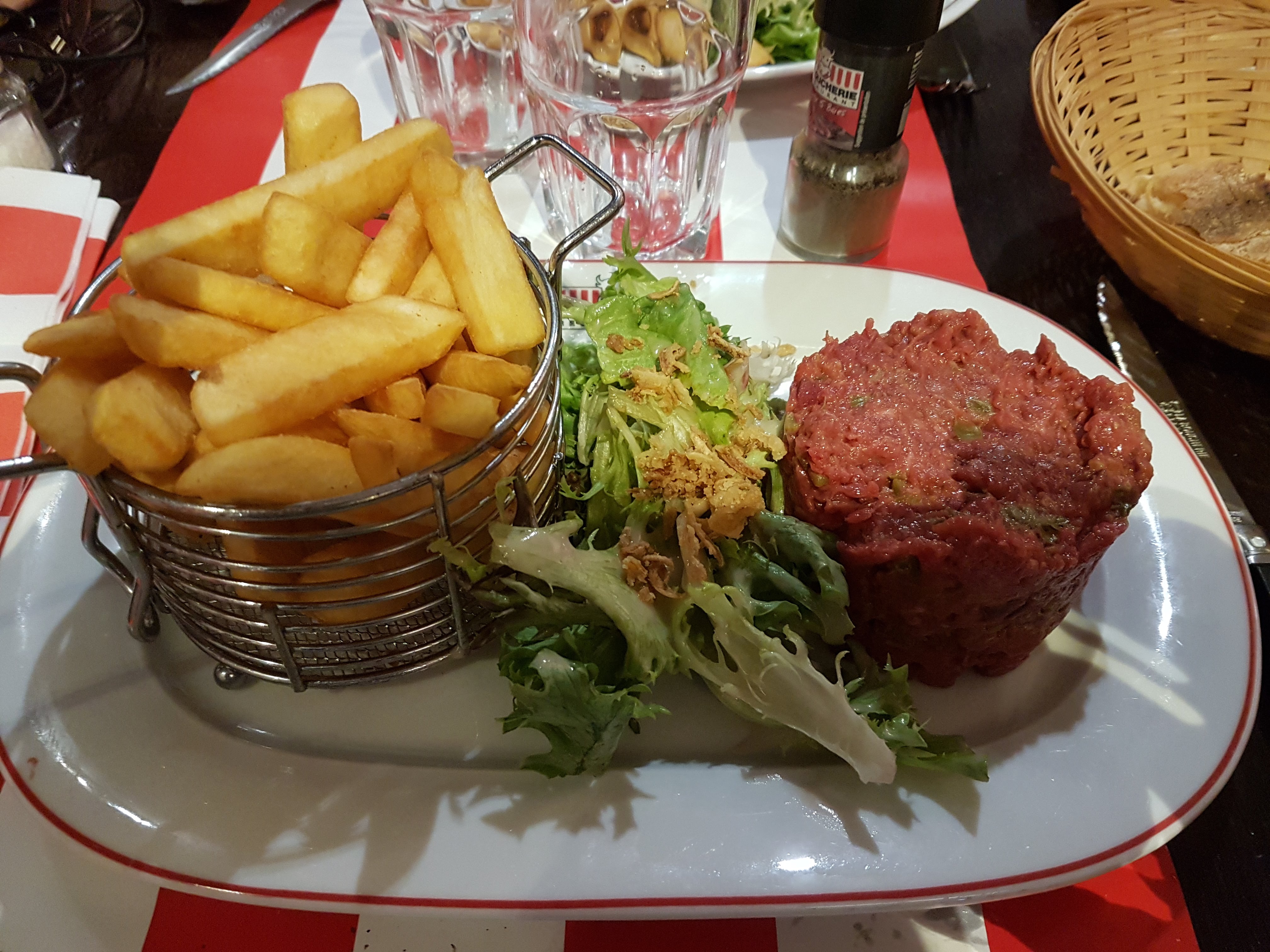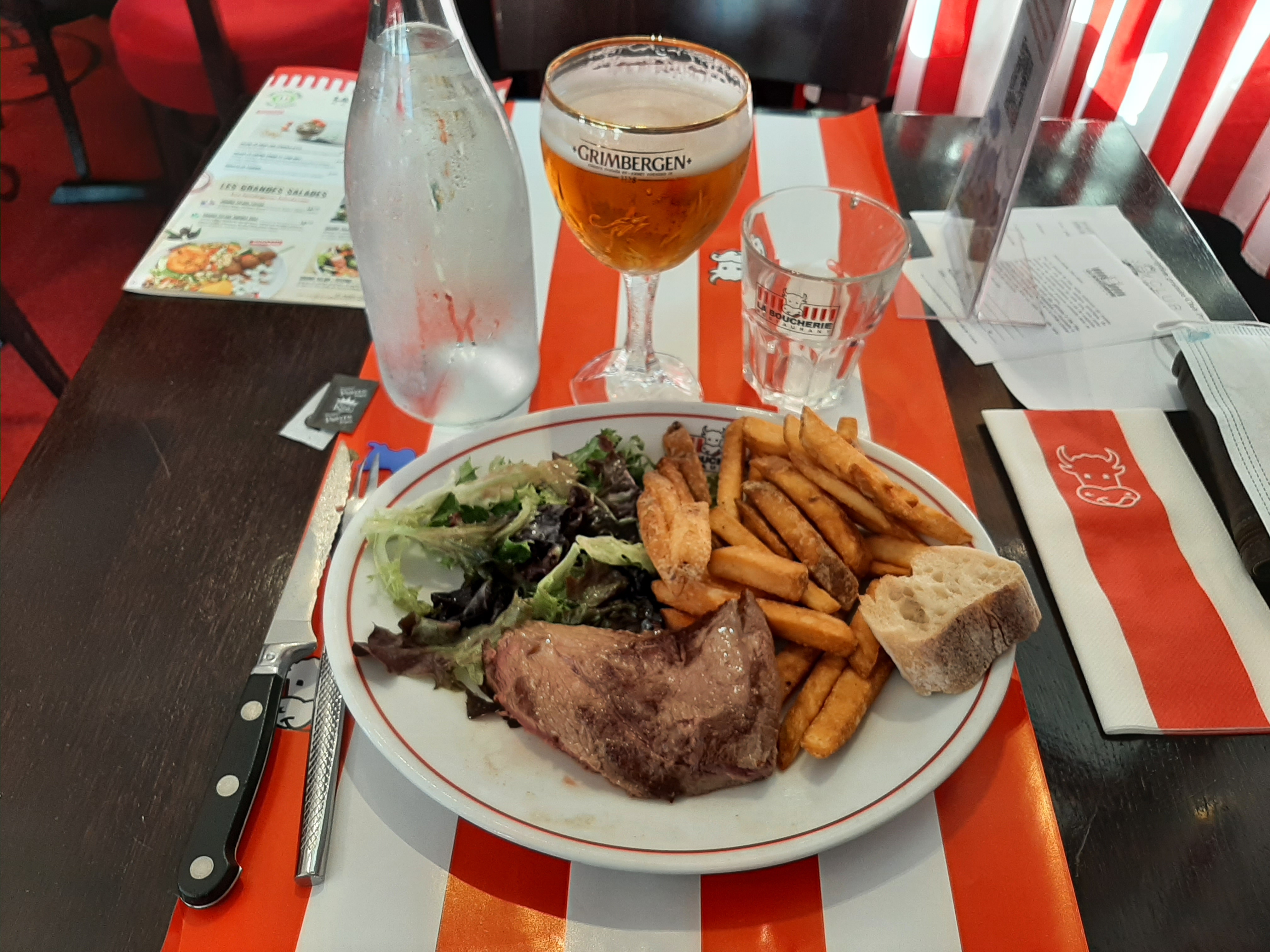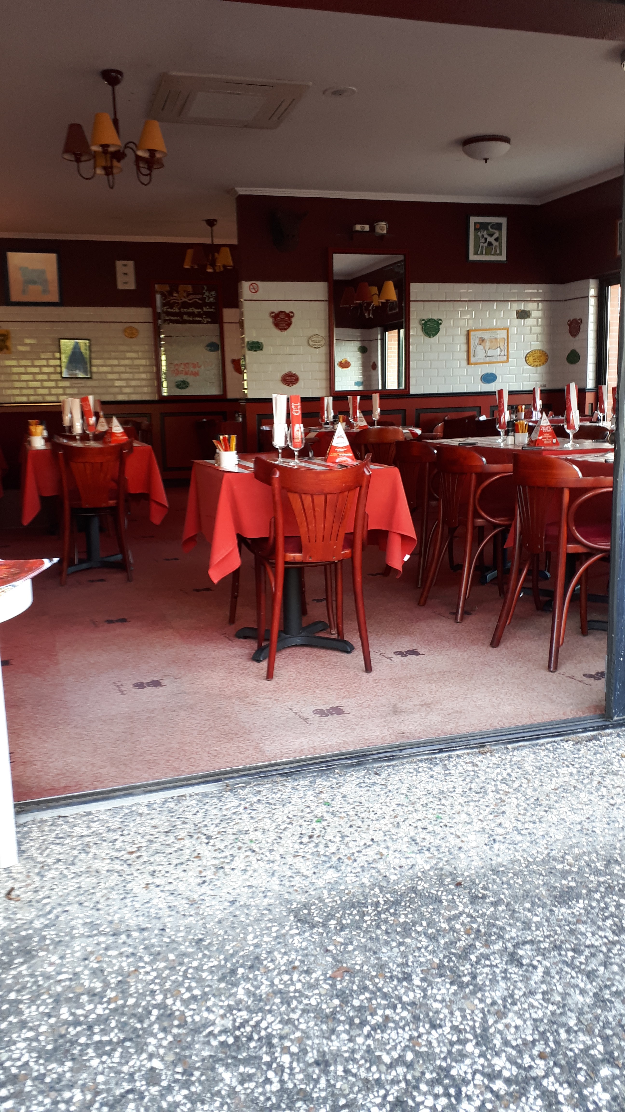 Posté le 10/11/2021 à 10:59"Accueil sympathique. Viande juste parfaite (bavette). Sauces (béarnaise et échalottes) qualité moyenne. Couverts qui mériteraient un peu plus d'attention (pas très propres). Gaufre au caramel en dessert super sèche, caramel à éviter goût indéfinissable... Temps d'attente assez long..."