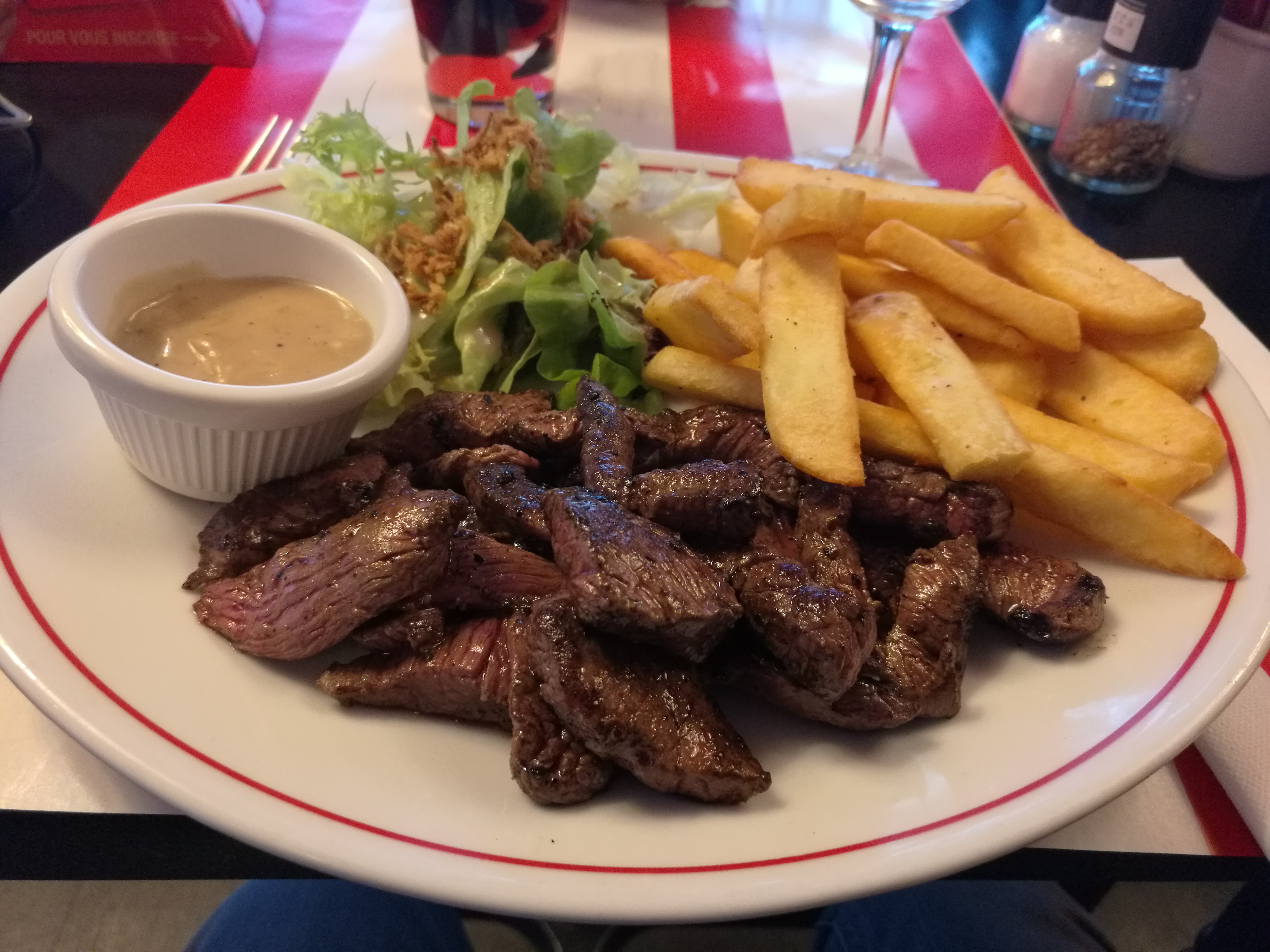L'huile qui a servi à cuire les frites aujourd'hui a dû connaître des jours meilleurs. La viande (araignée pour moi) avait mauvais goût et était trop fine pour avoir une cuisson adaptée.Service sans âme.
