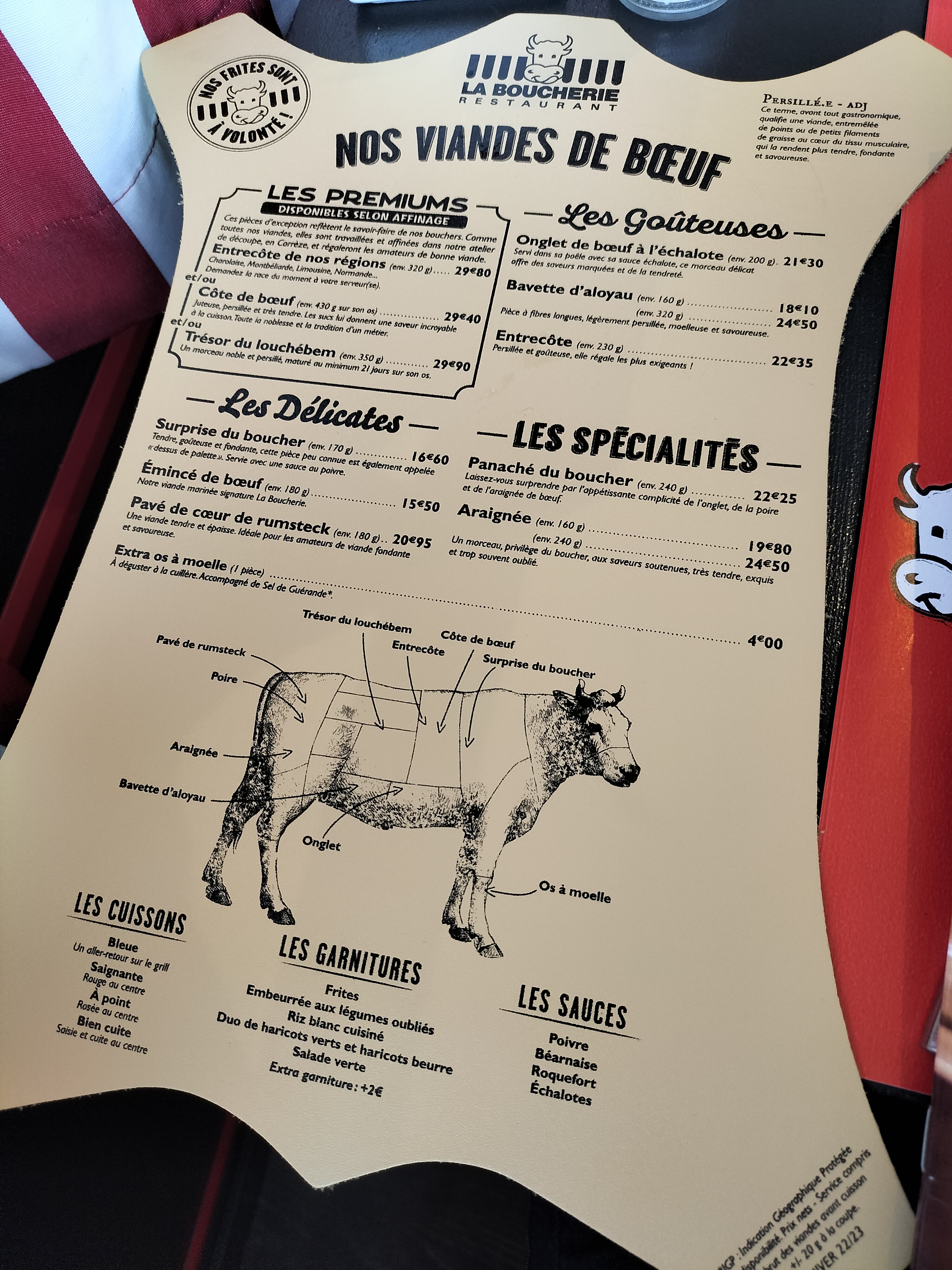Posté le 10/05/2024 à 19:37"Bonne côte de bœuf. Glaces très bonnes. Serveuse et accueil souriant. Il manque l’entrain et l’ambiance habituel des boucheries..."
