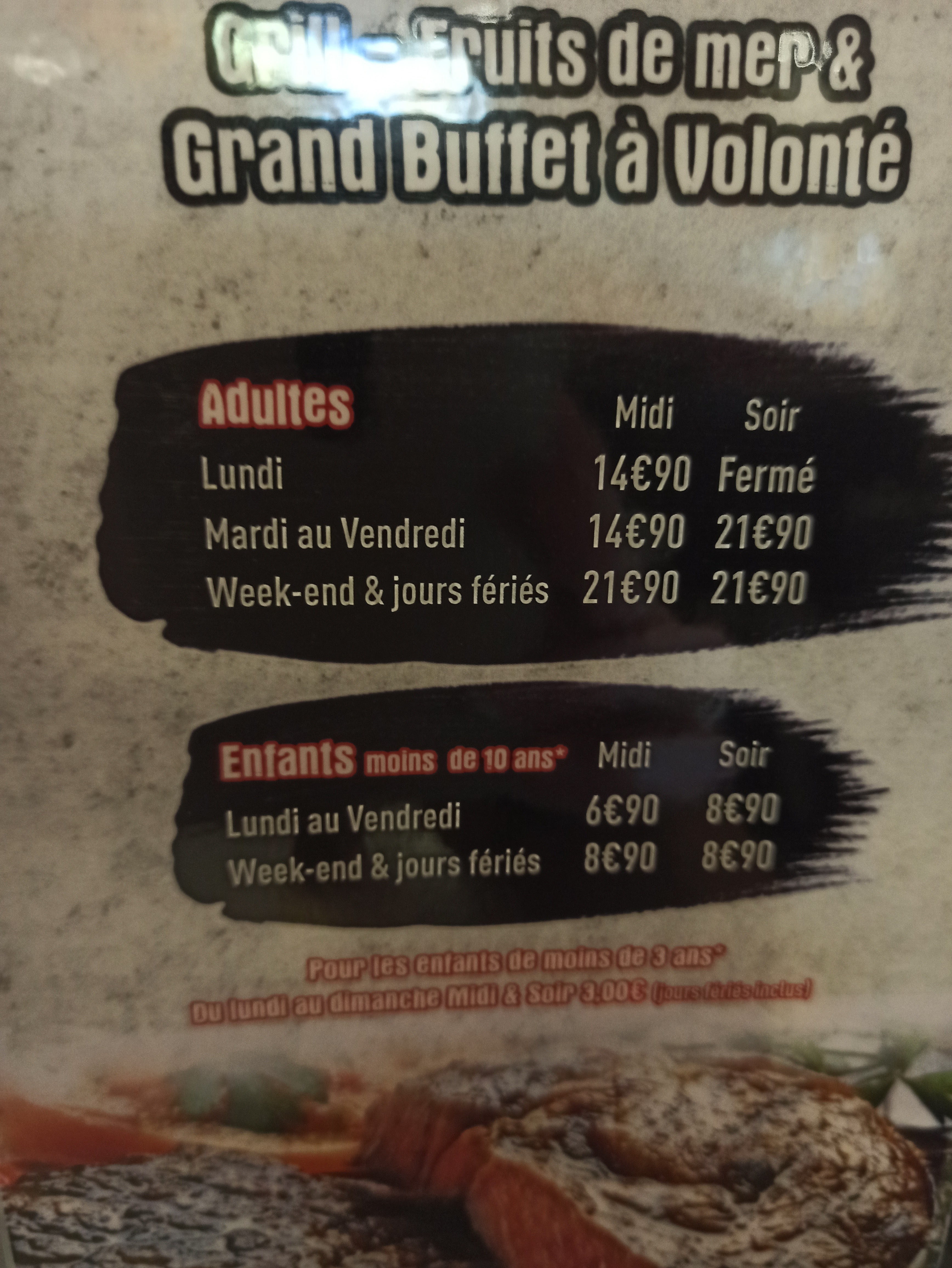 L endroit est sympa. Bruyant mais c est typique des buffets à volonté. Le personnel est agréable. Pour la viande sur grill que j avais choisil entrecote était de très bonne qualité. Le menu enfant au delà de 3ans est de 11.99 et 3 euros en dessous de 3 ans. Vous êtes facturé d office. 21.99 euros pour un adulte Je pense que c est un bon rapport qualité prix dans l ensemble. J améliorerais ma notation sur une autre visite de confirmation.